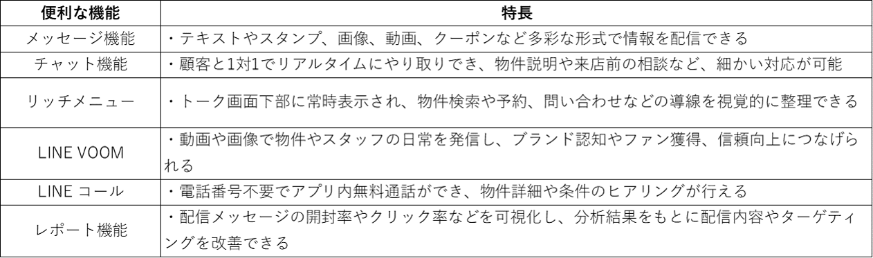 LINEには、不動産マーケティングや顧客対応を強力にサポートする多くの機能があります。ここでは、集客・追客・成約率向上に役立つ代表的な機能を紹介します。