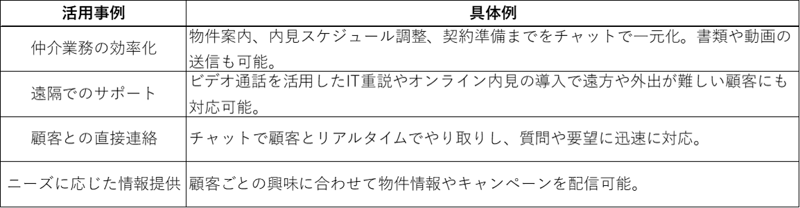 不動産の販売・賃貸・仲介などの営業やマーケティングに上手に活用することで、対面で行う顧客対応にリソースを大きく割くことができ全体的な成約増加につながります。